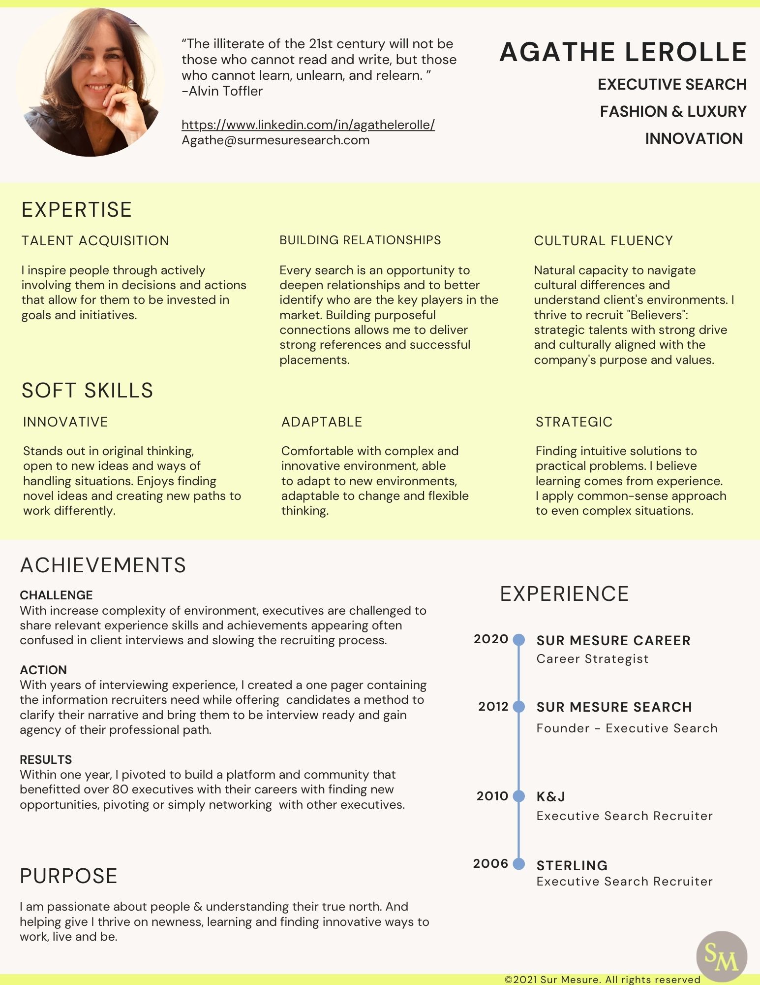 I had the great opportunity to follow Agathe’s Sur Mesure Clarity course and it really helped me better define my objectives and articulate my next career goals accordingly.